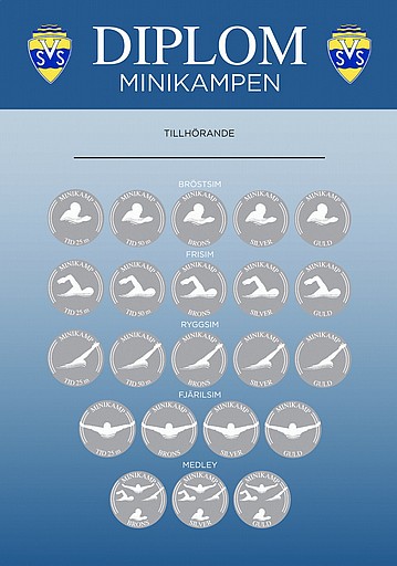 Första gången simmaren är med på Minikampen får hen ett diplom. För varje stipulerad tid som klaras av får simmaren ett bevis i form av en klisterdekal att fästa på sitt diplom.